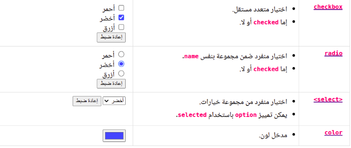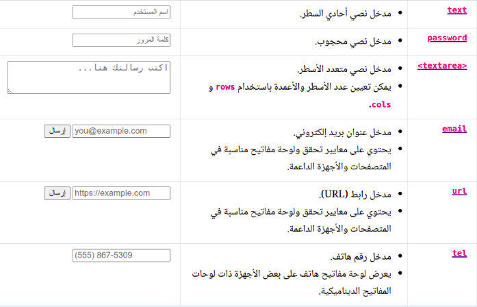 ملاحظة: أغلب العناصر من جنس العنصر input لكن هناك عنصران آخران هما: textarea و select.